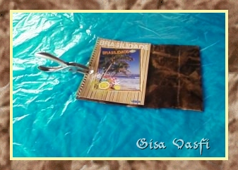 Cole a capa original com uma capa recortada na caixa de filtro, para fazer a capa da frente do caderno. E cole  a capa original com uma capa recortada na caixa dos filtros, tendo o cuidado de colocar o tecido em uma das extremidades, como mostra a foto. Na outra extremidade cole as duas tiras de 5cm de papelão retirado das caixas de filtros.