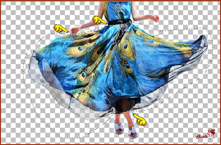Selecione a saia da moça e promova à nova layer. Note que em 3 áreas eu selecionei bem rente à saia e nas outras selecionei mais afastado por causa do drop shadow.